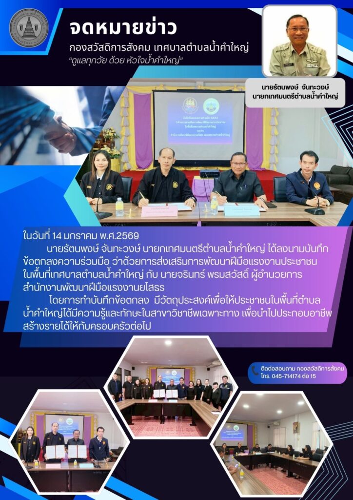 นายรัตนพงษ์ จันทะวงษ์ นายกเทศมนตรีตำบลน้ำคำใหญ่ ได้ลงนามบันทึกข้อตกลงความร่วมมือว่าด้วยการส่งเสริมการพัฒนาฝีมือแรงงานประชาชนในพื้นที่เทศบาลตำบลน้ำคำใหญ่ กับ นายจรินทร์ พรมสวัสดิ์ ผู้อำนวยการสำนักงานพัฒนาฝีมือแรงงานยโสธร