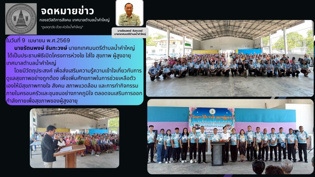 ในวันที่ 9 เมษายน พ.ศ.2569 นายรัตนพงษ์ จันทะวงษ์ นายกเทศมนตรีตำบลน้ำคำใหญ่ ได้เป็นประธานพิธีเปิดโครงการห่วงใย ใส่ใจ สุขภาพ ผู้สูงอายุ เทศบาลตำบลน้ำคำใหญ่ โดยมีวัตถุประสงค์ เพื่อส่งเสริมความรู้ความเข้าใจเกี่ยวกับการดูแลสุขภาพอย่างถูกต้อง เพื่อเพิ่มศักยภาพในการช่วยเหลือตัวเองให้มีสุขภาพกายใจ สังคม สภาพแวดล้อม และการทำกิจกรรมภายในครอบครัวและชุนชนอย่างภาคภูมิใจ ตลอดจนเสริมการออกกำลังกายเพื่อสุขภาพของผู้สูงอายุ